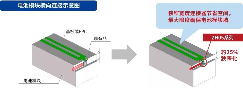 随着电池生产数量的增加对安全性的要求 一般监控车载电池电压等连接到带电部位时,使用棒状突出的公端子作为基板端的连接器。但是,现有的连接器端子形状会产生异物附在相邻端子之间,从而产生短路的风险。而且工作人员在进行插拔作业时接触到端子会有触电的风险。在世界范围内,随着向混合动力车和EV(电动汽车)转移的趋势,电池的生产数量不断增加,这也意味着风险的增加,那么安全对策就成为了当务之急。 创造性的结构,确保高安全性 为了满足这样的需求,“ZH05”在追求车载品质和防止触电这两点上进行了开发。板对线连接器采用箱型的公端子,用树脂将端子周围物理性包围使之绝缘,并实现了即便有异物进入也不会造成短路,工作人员不会触摸到端子的革新化的防触电结构。另外,采用了公端子独有的双弹簧结构,确保了适合车载内部连接使用的耐热性及耐振动性,从而完成了高可靠性的连接器。并且,由于在电池方面,电池的容量很重要,所以也追求其小型化,这就是“ZH05”。 防触电车载用板对线连接器“ZH05” (1) 基板端连接器的公端子周围用树脂包围的防触电构造。