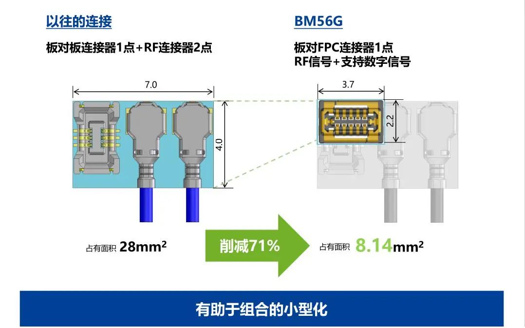 尺寸 省空间 防燥对策 RF特性(连接器单体) RF特性(连接器+FPC) 牢固构造 端子锁扣构造 通过金属诱导实现了较大的自校正量